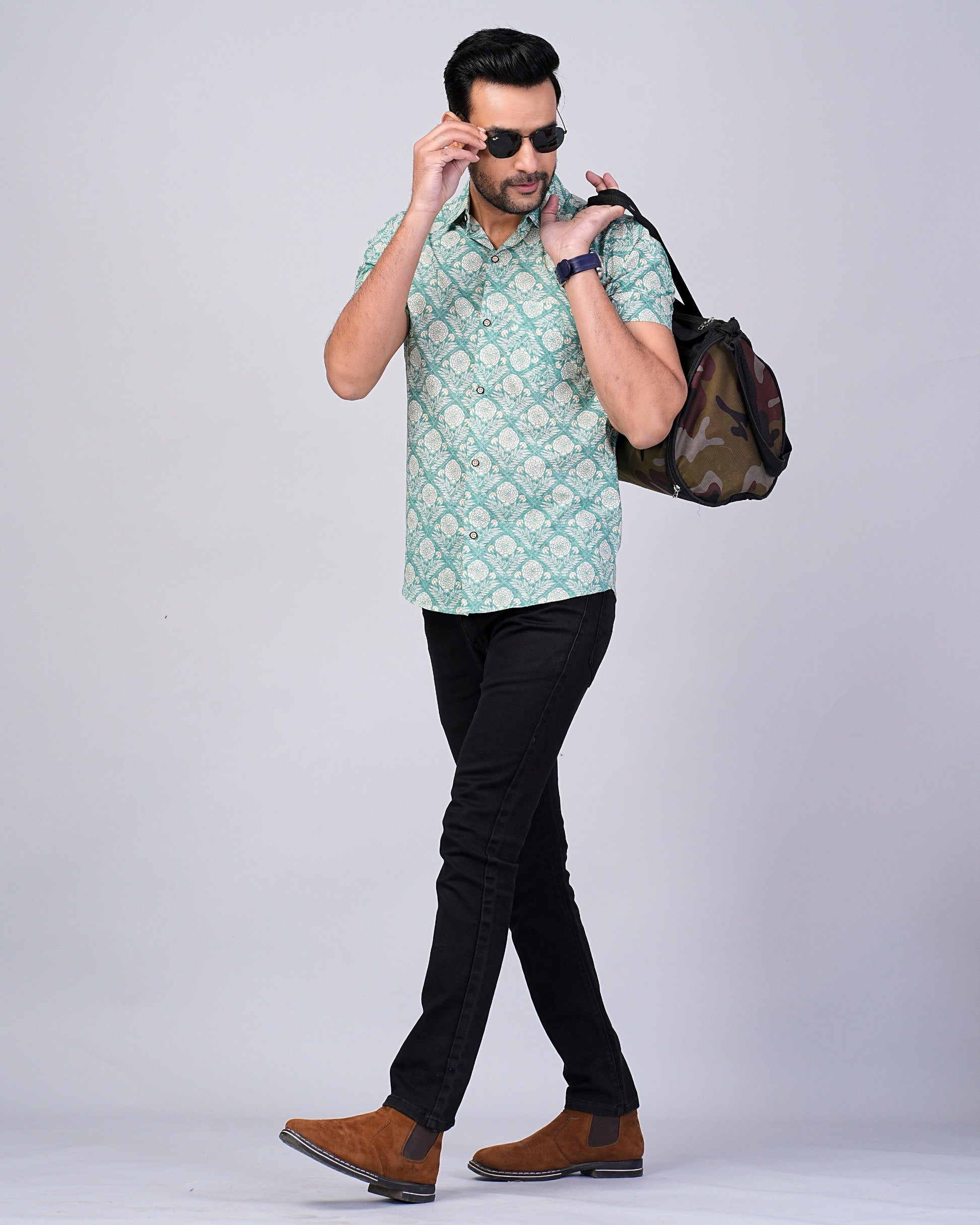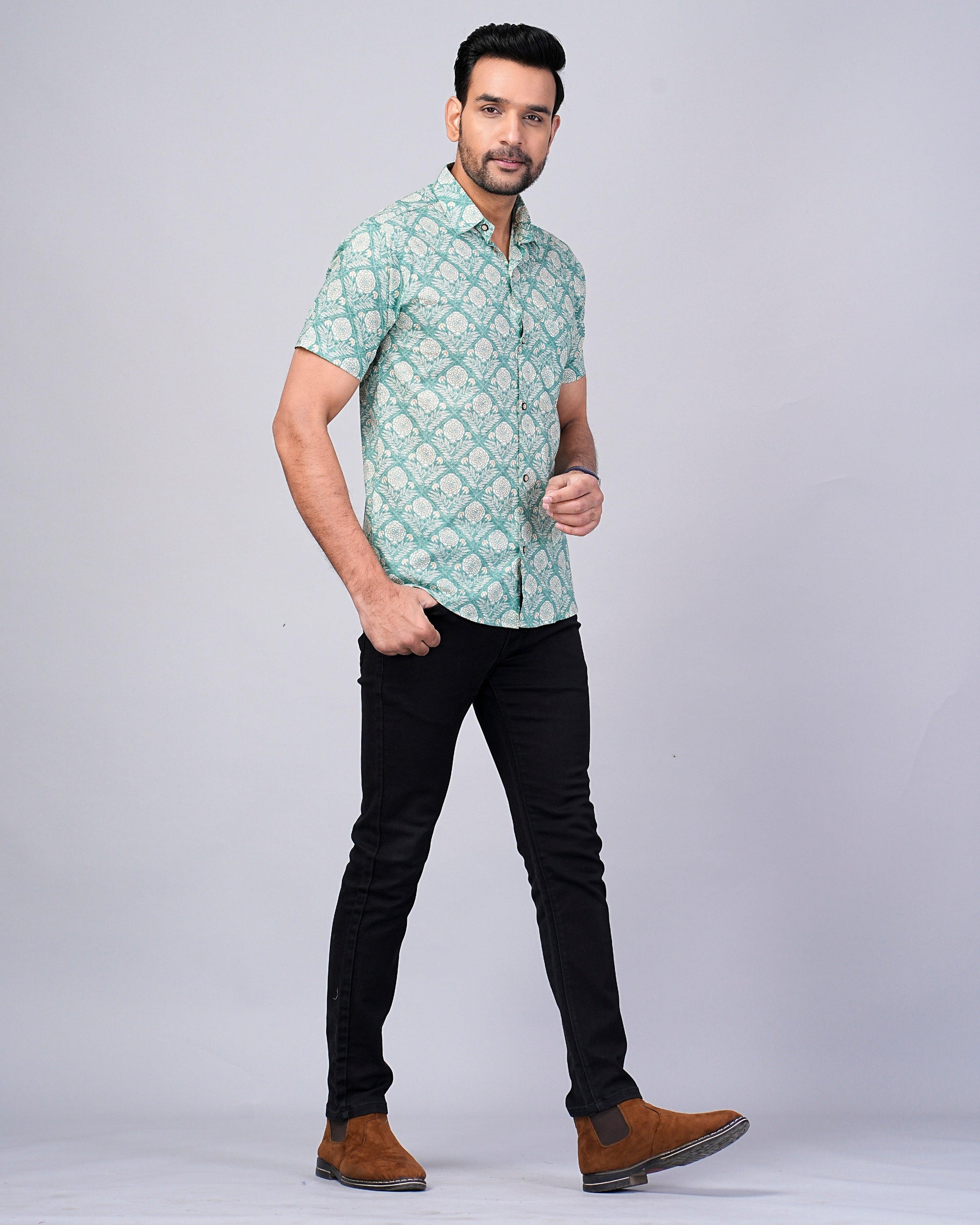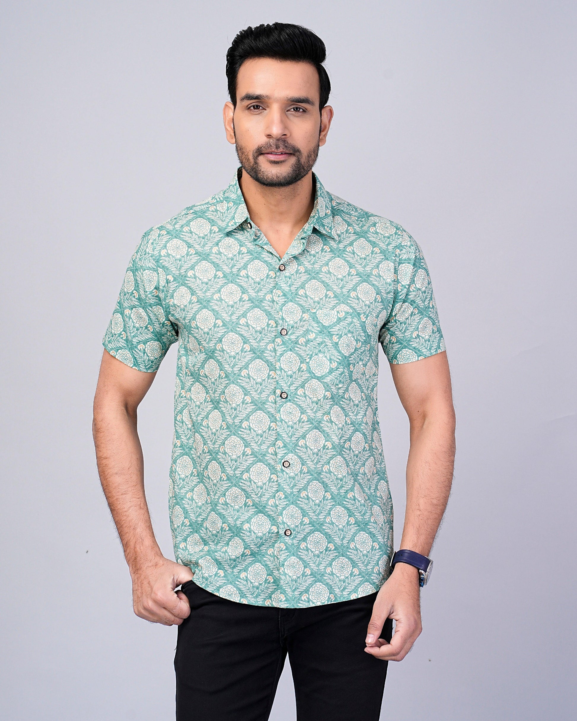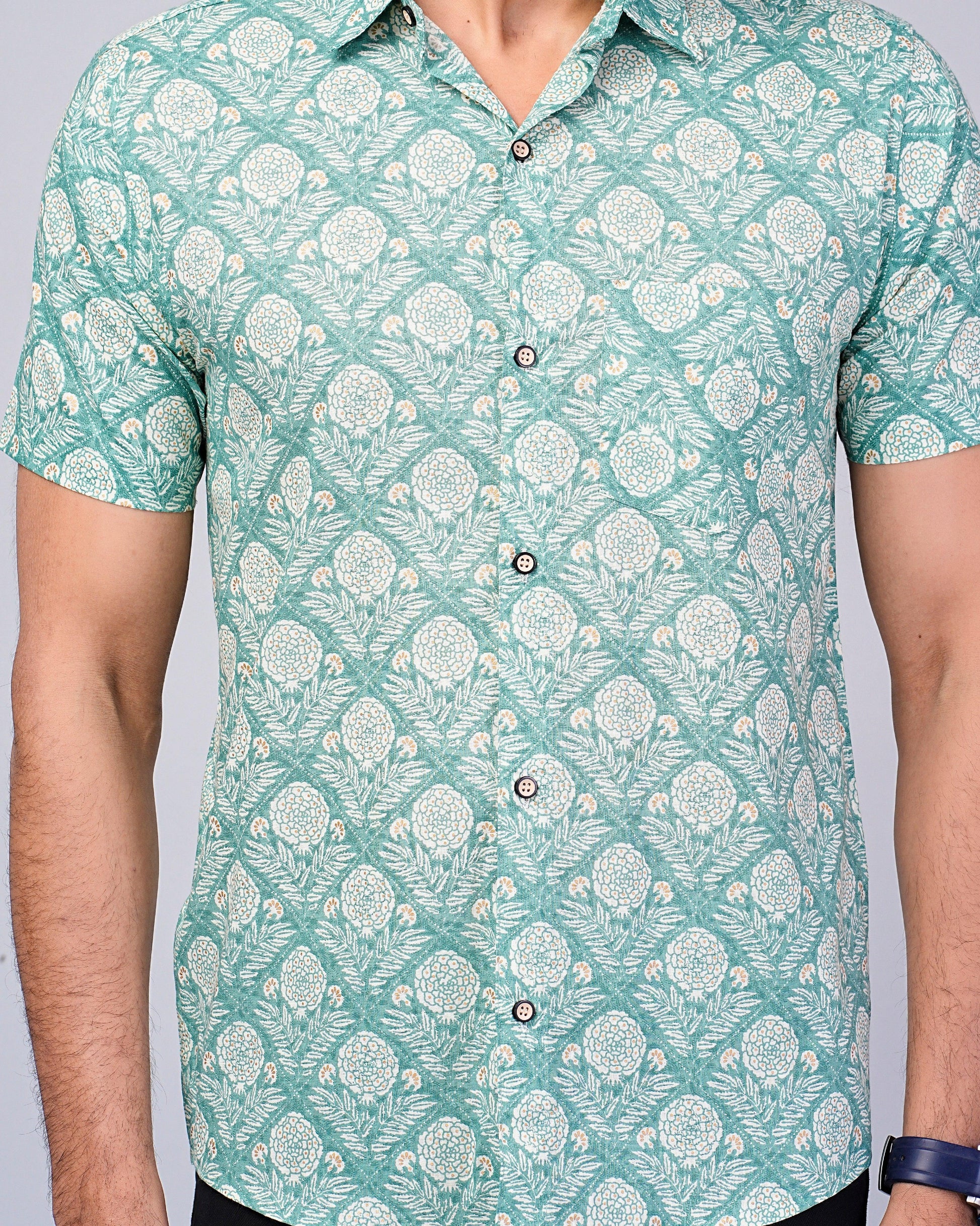 Men's Sage-Green Floral Printed Half-Sleeves shirts